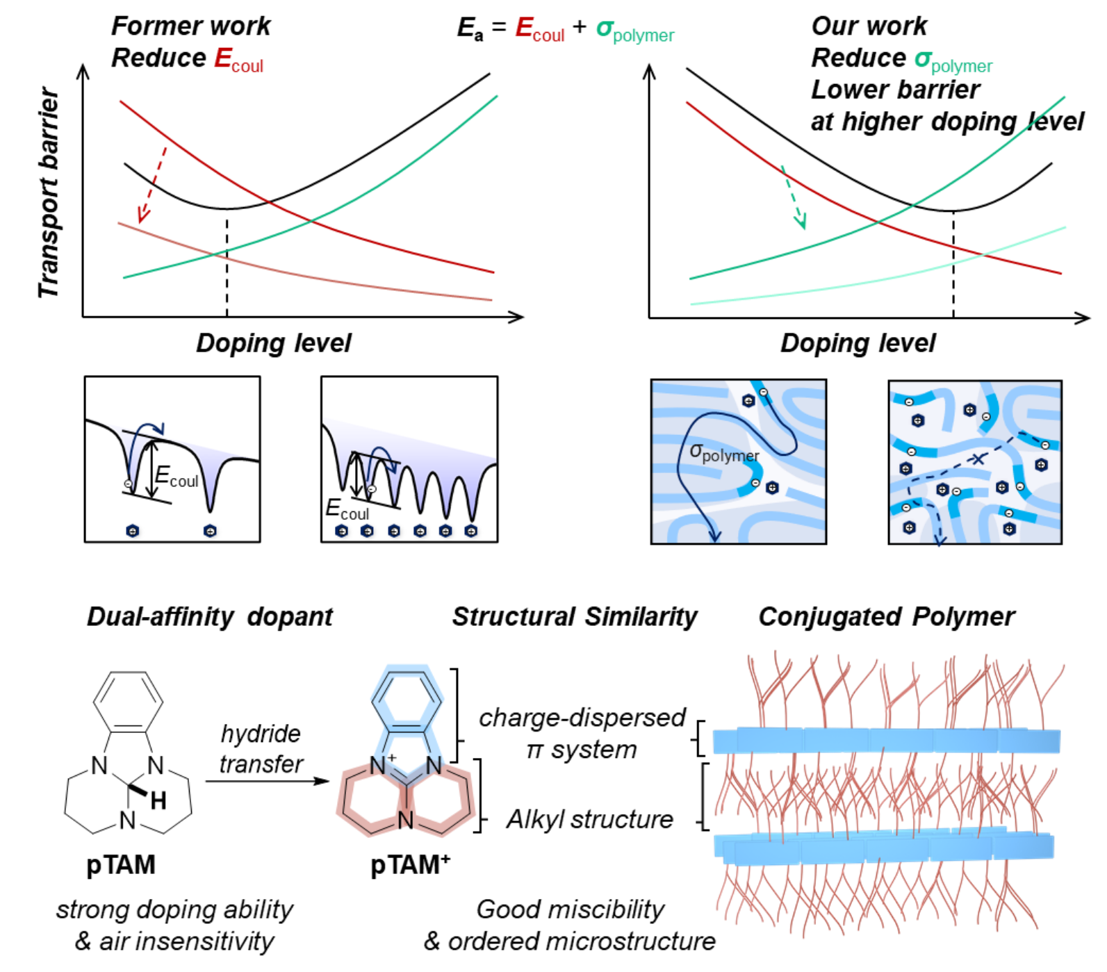 图1 结构无序对共轭高分子掺杂工程的影响与 pTAM 结构设计示意图