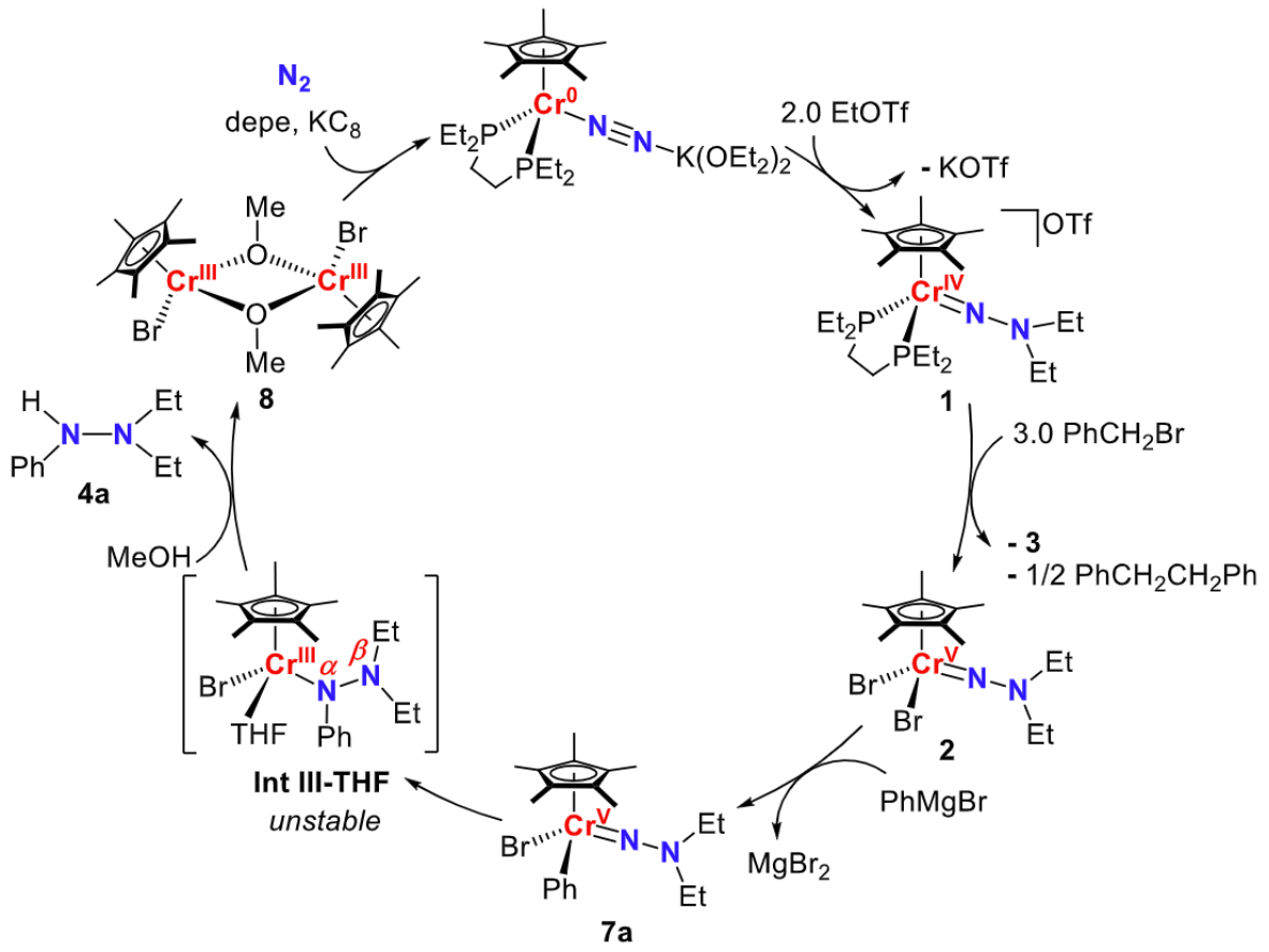 反应结束后,除了分离得到多取代肼,研究人员还从体系中回收到了Cr(III)二聚体配合物8。该配合物在氮气氛围中加入双膦配体depe和还原剂KC8后可以重新生成铬的氮气配合物,完成整个合成循环(图7)。配合物1转化到配合物2过程中生成的季鏻盐3与LiAlH4反应可再生双膦配体depe,实现双磷配体的回收利用。