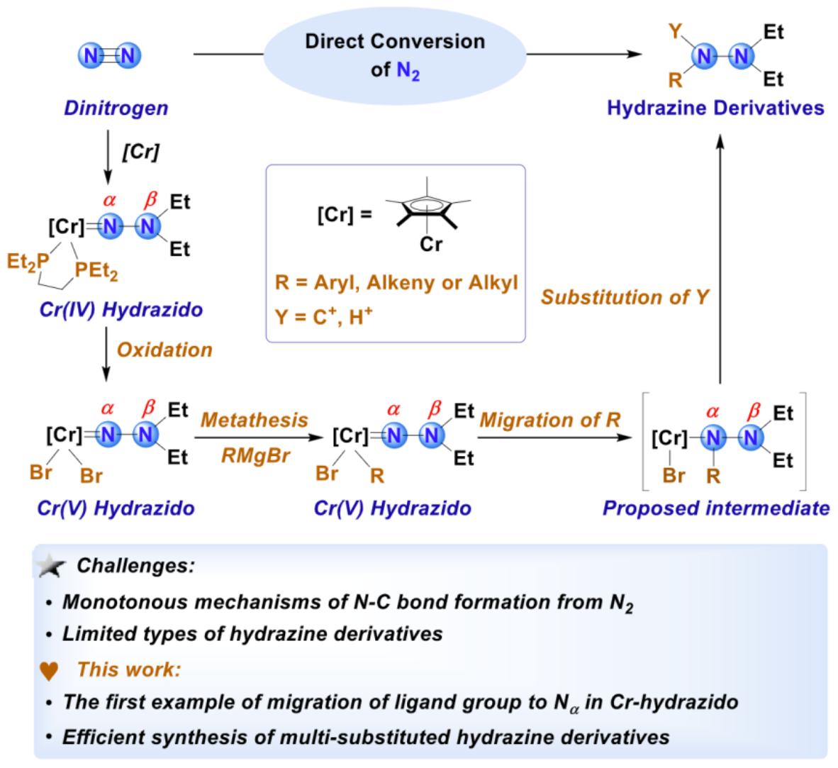 目前,多取代肼的合成主要依赖于苯胺及其重氮盐,后者具有爆炸风险,不仅带来安全隐患,还伴随着高能耗和大量固体废弃物的产生。麻豆精品秘 国产传媒席振峰/魏俊年团队基于对铬-氮气配合物衍生化的持续深入研究(J. Am. Chem. Soc. 2019, 141, 4241; J. Am. Chem. Soc.2023, 145, 7065; J. Am. Chem. Soc.2023, 145, 9746; Inorg. Chem.2023, 62, 18641; Acc. Chem. Res.2023, 56, 3211; Angew. Chem. Int. Ed.2024, 63, e202315386; Nat. Commun.2025, 16, 674; Inorg. Chem.2025, 64, 17666),报道了一种直接从氮气合成多取代肼衍生物的新方法。该方法通过精准调控亚肼基铬配合物的价态和配位环境,促使碳负离子经Cr="N中间体发生迁移,在C–N键的形成中发挥关键作用(图1)。