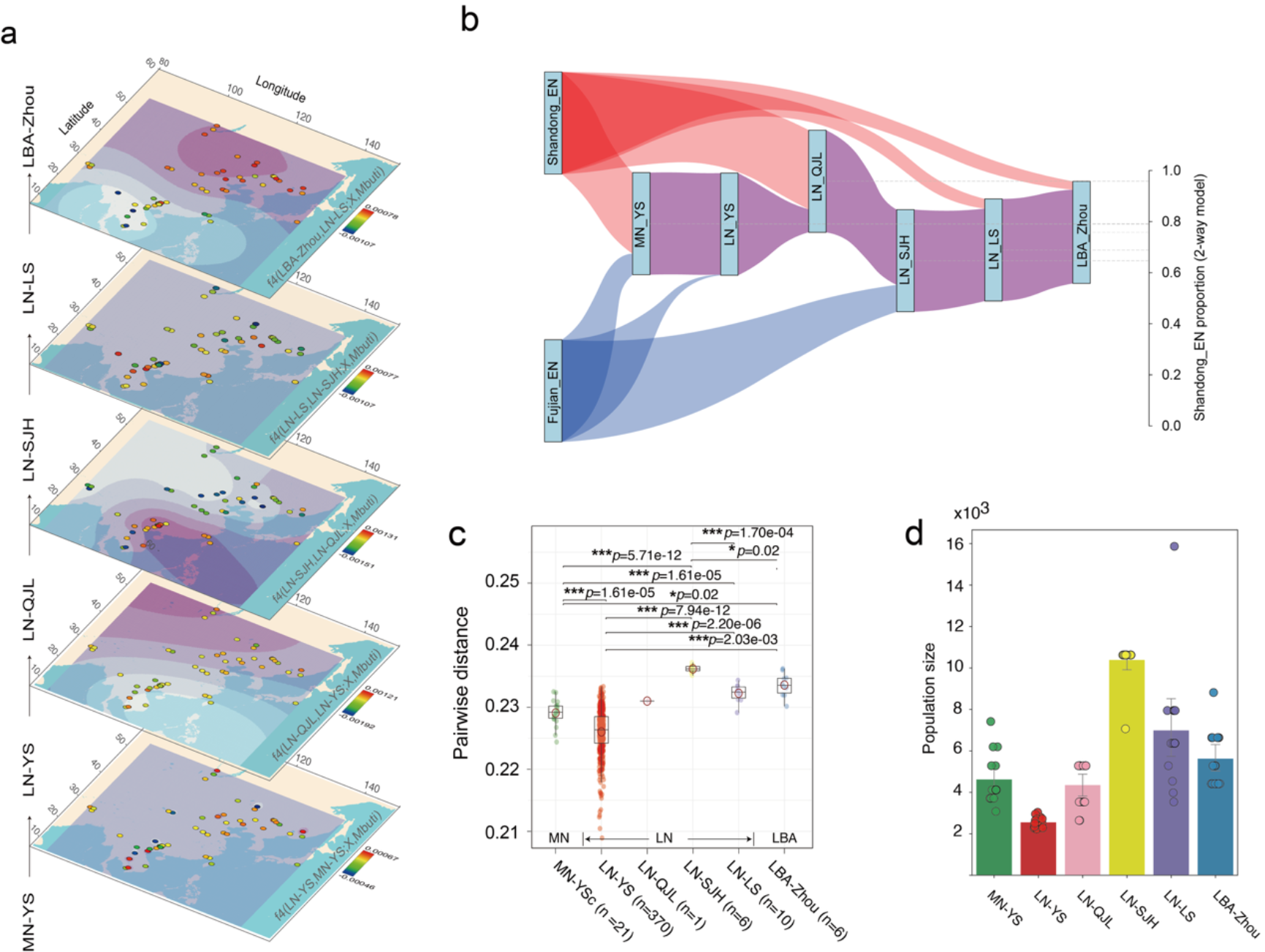 图2. 八里岗人群的遗传结构与祖源成分的动态变化