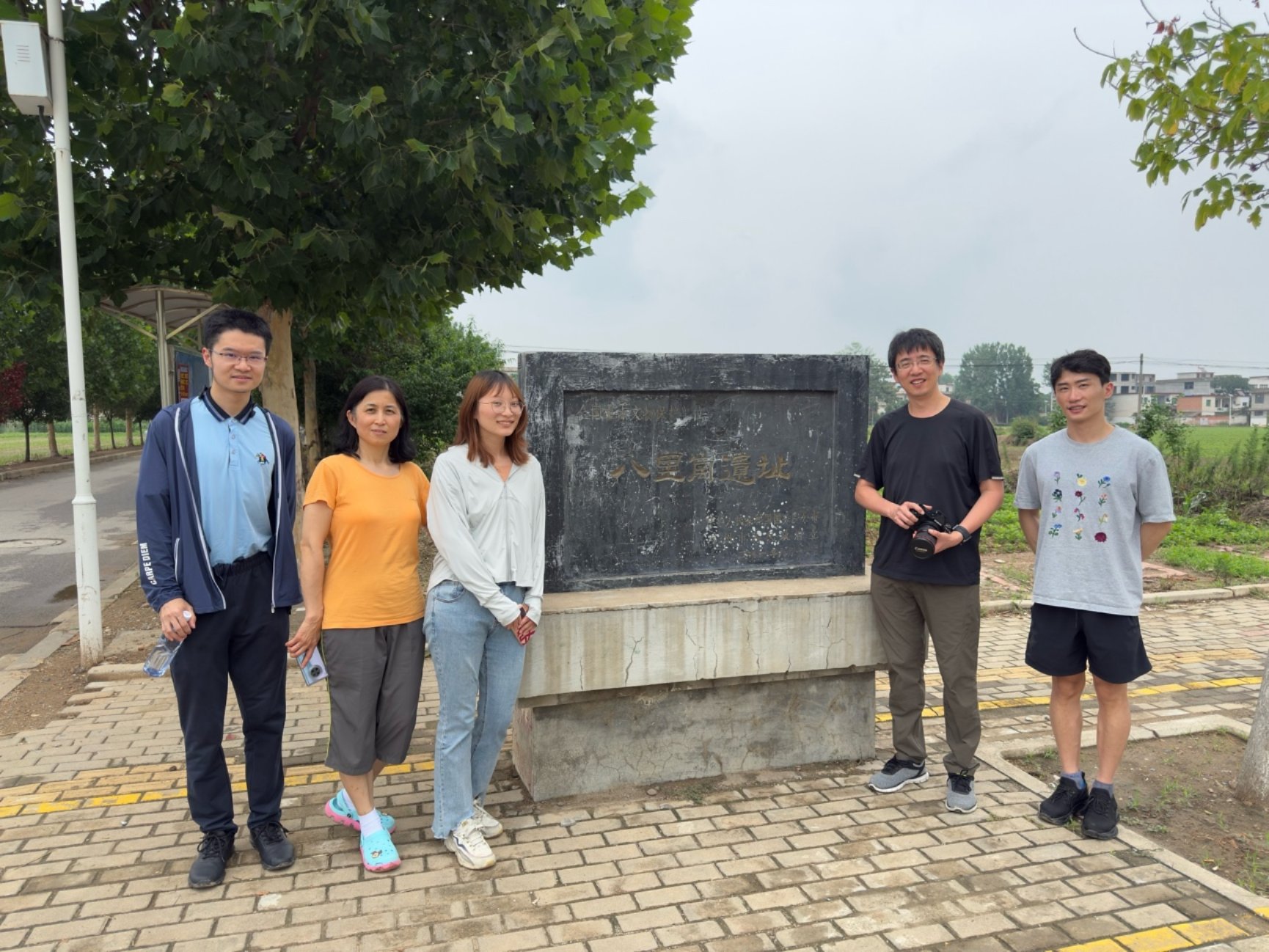 图4. 部分作者在八里岗遗址合影(左起:张天明、庞玉宏、杨婷玉、黄岩谊、王劲成)