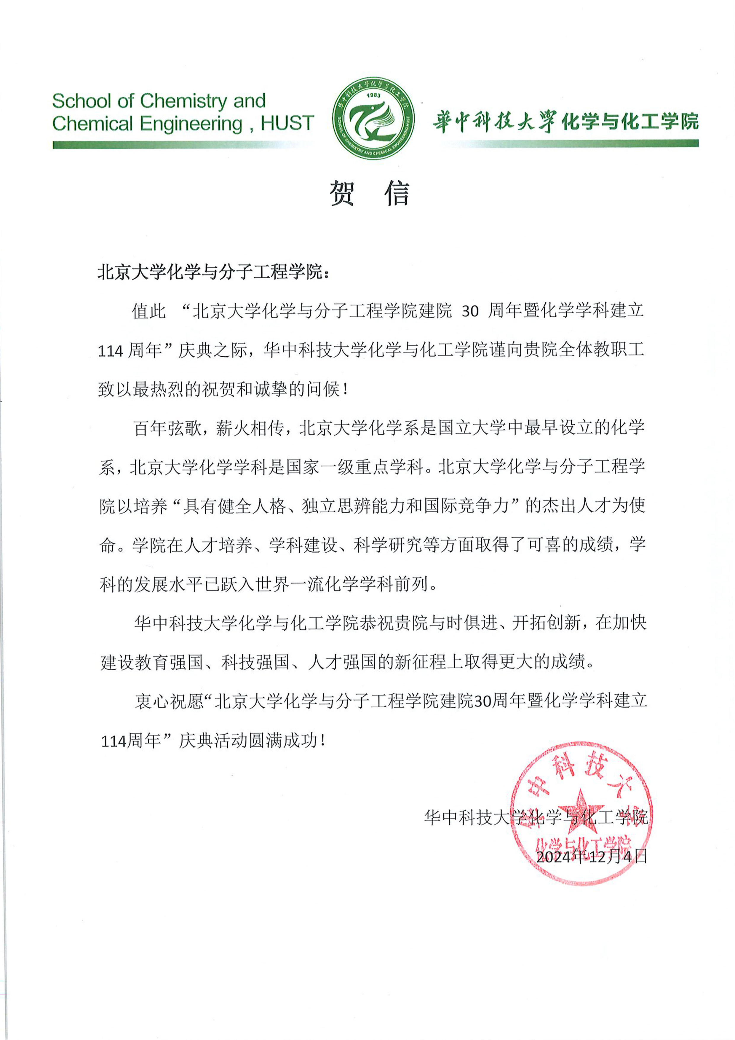 【贺信】-华中科技大学化学与化工学院