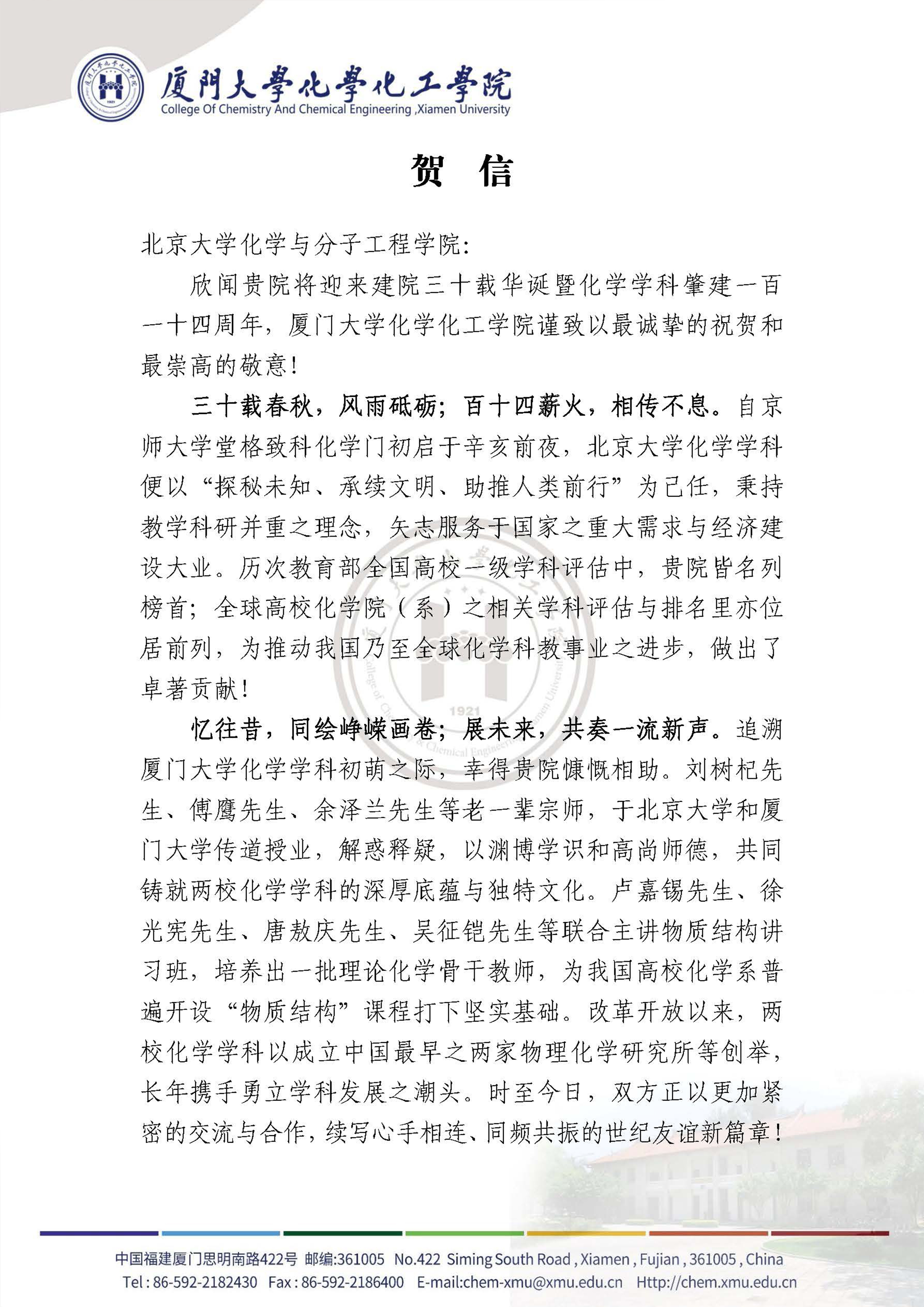 【贺信】-厦门大学化学化工学院
