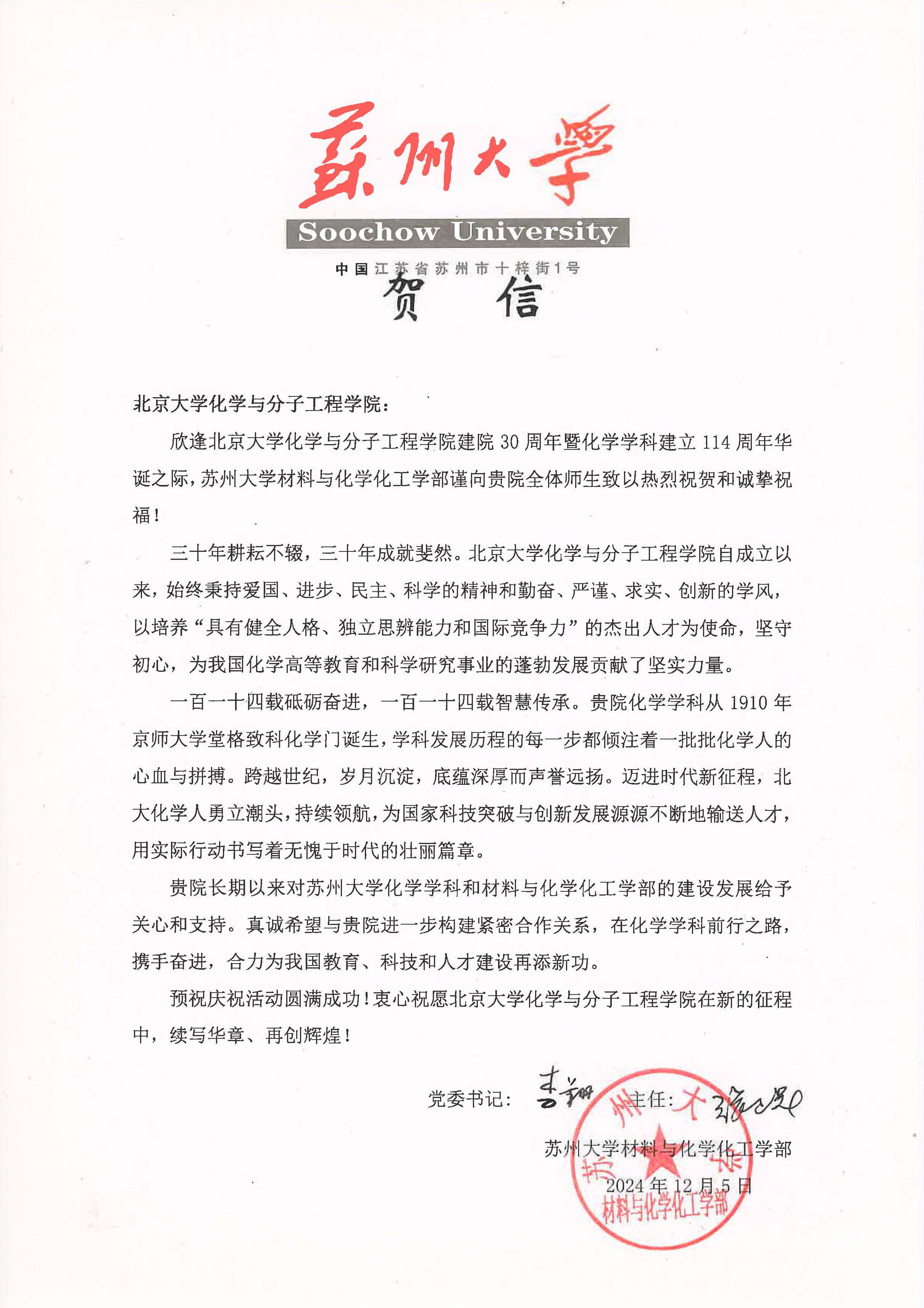 【贺信】-苏州大学材料与化学化工学部